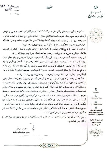 ۲۷ آذرماه یادآور اندیشههای والای امام خمینی (رضوان الله تعالى علیه) بنیانگذار کبیر انقلاب اسلامی و شهدای گرانقدر عرصه علم و جهاد همچون شهیدان والامقام هستهای و شهدای مدافع حرم است که با خون پاک خود مسیر وحدت و پیشرفت را روشن ساختند. روزی که نماد پیوند ناگسستنی میان حوزههای علمیه به عنوان خاستگاه معارف الهی و فقه پویا و دانشگاهها به عنوان مراکز دانش نوین و فناوری پیشرفته میباشد.